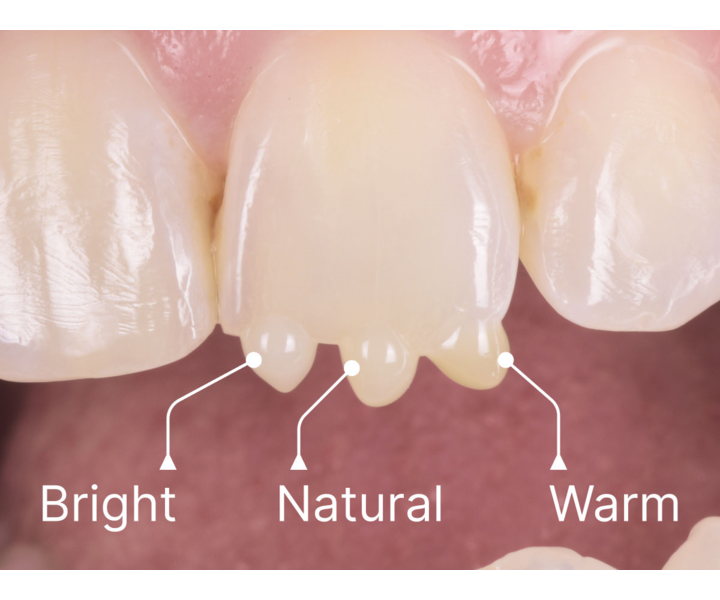 Mit den Farbtönen Bright, Natural und Warm vereinfacht das System die Farbauswahl erheblich. Ein kurzer Blick genügt, um die perfekte Übereinstimmung mit der Zahnfarbe der meisten Patientinnen und Patienten zu erreichen. Die Farben sind so konzipiert, dass sie nahtlos in die bestehende Zahnstruktur übergehen und eine ästhetisch ansprechende, natürliche Restauration ermöglichen.