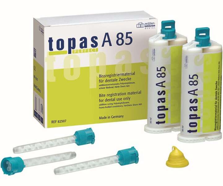 Müller-Omicron Topas perfect A85 aus der Kategorie Bissregistrierung ist ein ausgezeichnetes Produkt für die zahnärztliche Praxis. Bissregistriermaterial auf A-Silikon Basis im neuen Sicherheits-Kartuschen­system, standfest, fließt nur unter Druck, ...